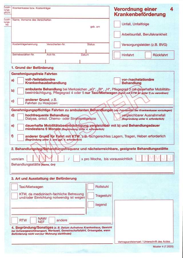 Wichtig hierfür ist nur, dass auf der Verordnung einer Krankenbeförderung als Kostenträger Ihre Berufsgenossenschaft eingetragen ist und ein Kreuz bei „Arbeitsunfall, Berufskrankheit“ gemacht wurde.