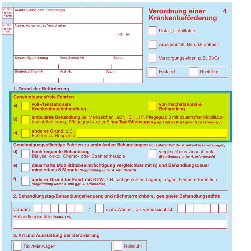 Bei einem stationären Krankenhausaufenthalt können Sie sich von Ihrem Hausarzt eine Verordnung einer Krankenbeförderung geben lassen und ganz bequem mit dem Taxi ins nächstmögliche Krankenhaus fahren. Gleiches gilt selbstverständlich auch wieder bei der Beendigung Ihres Krankenhausaufenthaltes.